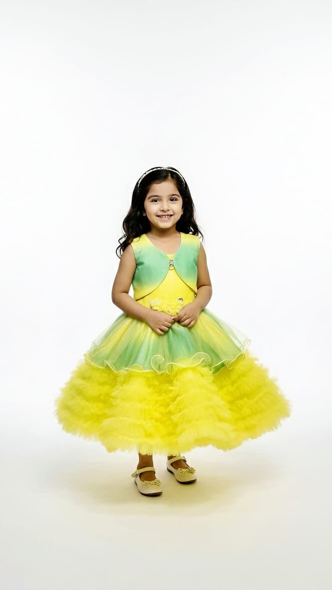 Beautiful girls princess-style party gown in vibrant yellow and green, featuring a layered tulle skirt and comfortable sleeveless design. Perfect for birthdays, parties, and special occasions, giving a charming and playful look.