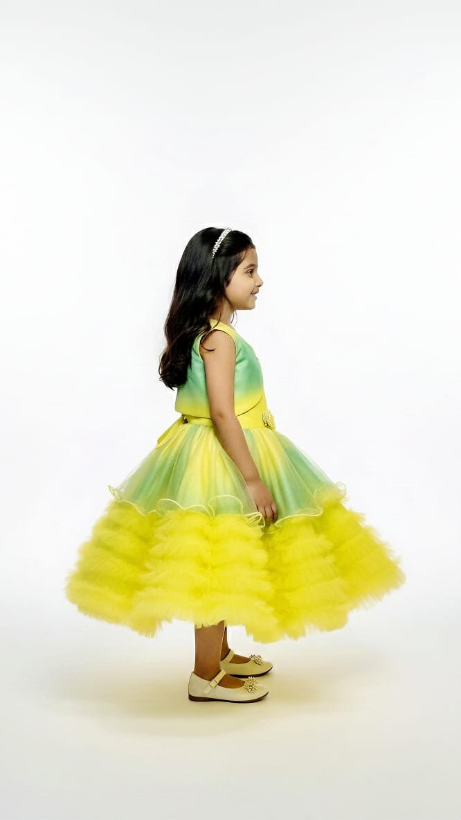 Beautiful Kids girls princess-style party gown in vibrant yellow and green, featuring a layered tulle skirt and comfortable sleeveless design. Perfect for birthdays, parties, and special occasions, giving a charming and playful look.